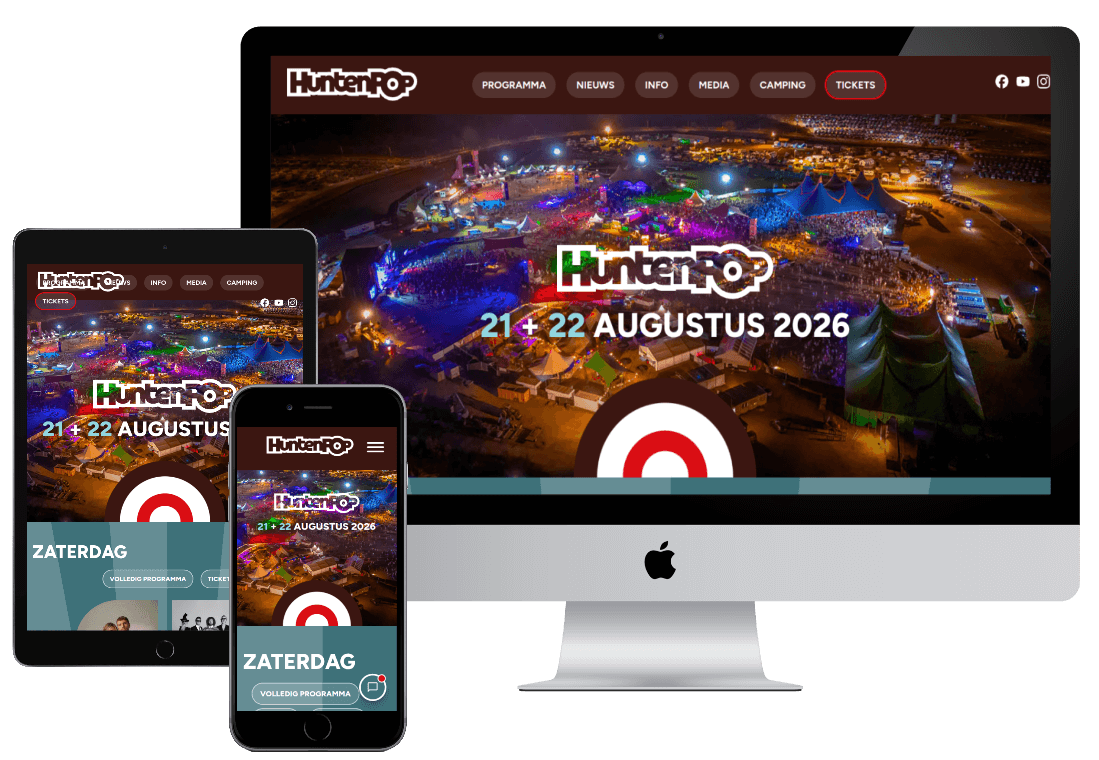 Voor Huntenpop realiseerde Integrity Design een website die grote hoeveelheden informatie overzichtelijk ontsluit voor bezoekers, vrijwilligers en partners. De site ondersteunt ticketverkoop, programma-informatie, praktische zaken en nieuws, met een duidelijke structuur die bestand is tegen piekbelasting rondom het festival.
